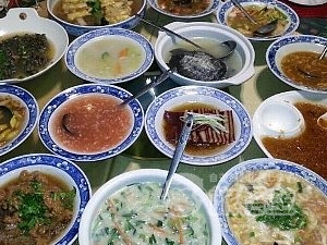 洛陽水席とは、洛陽の山に囲まれた盆地という地形に雨の少なく、冬寒い気候からスープが重宝され、今に伝えられたコース料理です。冷たい料理(前菜)が8品、温かい料理(スープ)が16品、計24品の料理が登場します。最初にホストがスープのテスティングをさせられ、それをベースにコース全体の味が決まる。スープのベースは酢と胡椒だが、塩味、甘味、酸味、辛味など種類は多い。コースの初めに牡丹燕菜が出され、その時にウエイトレスによる料理由来の説明があり、これも同店の出し物となっている。卵とトマトのスープでコースの最後をしめる。