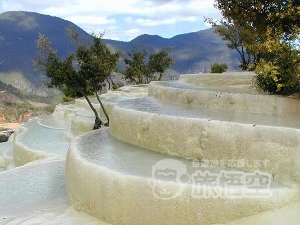 白水台は酸化カルシウムを多量に含む地下水が泉となって湧き出し、そこから流れ出る過程で徐々に結晶化しできあがった棚田式の台地です。四川省の黄龍を思わせる光景が広がります。その神秘的な様相から香格里...