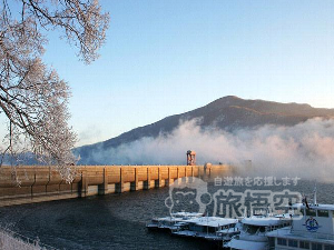 松花湖は第二松花江の上流にある豊満ダム(日本が建設した電源開発用ダム)の建設によってできた人造湖です。全長180km、水深は最も深い所で70m、湖面面積は550K㎡にあります。
