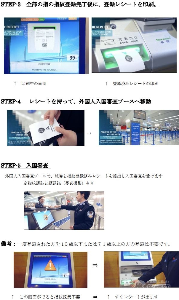 手続き:①初回入国時に指紋認証登録 (次回から不要)