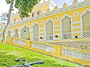 ゴアは当時イスラム教圏であり、現地から派遣されたムーア人兵士約200を収容していました。このため、シンプルなネオクラシック様式の中にイスラムの影響が見られるのが特徴で、2階部分、通りに面した幅4メートルの広い回廊(バルコニー)と外壁のアーチはイスラムのモスクを思わせる仕様。ライトアップされた夜の佇まいもとてもムードがあります。 現在もマカオ港務局事務所と海上警察本部として使われています。 |
