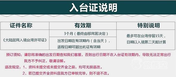| 入台证 / 台湾通行証 | 1人 | 机票酒店自订,我社只签证办 | |