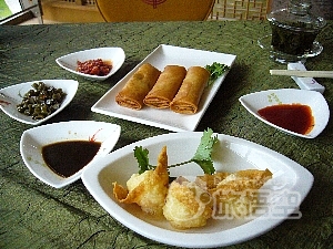 食器は金魚柄でややチャイナっぱい感じはありますが、とっても可愛いくて、キレイです。別注文で38元の鉄観音茶を注文しましたがガラスの茶器もオシャレですよね。 桜が咲く季節には、窓側の席から小さい木ではありますがピンク色の可愛い桜も見えるんですよ。店内も竹などのインテリアがあって中華料理ではありますが和の雰囲気も味わうことができます。オススメのメニューは青梗菜の炒め物、見事に鮮やかで繊細な味付けでした。蒸し物や揚げ物のなかのプリップリの海老の食感もたまりません。さらに、甘いもの好きの方にはこの雪見大福のようなおやつ。中には果物と生クリームがたっぷり入っているんです。ディナーも17:30から21:30まで営業しているので点心だけではなく、夜の接待などにも使えそうですよ。 |